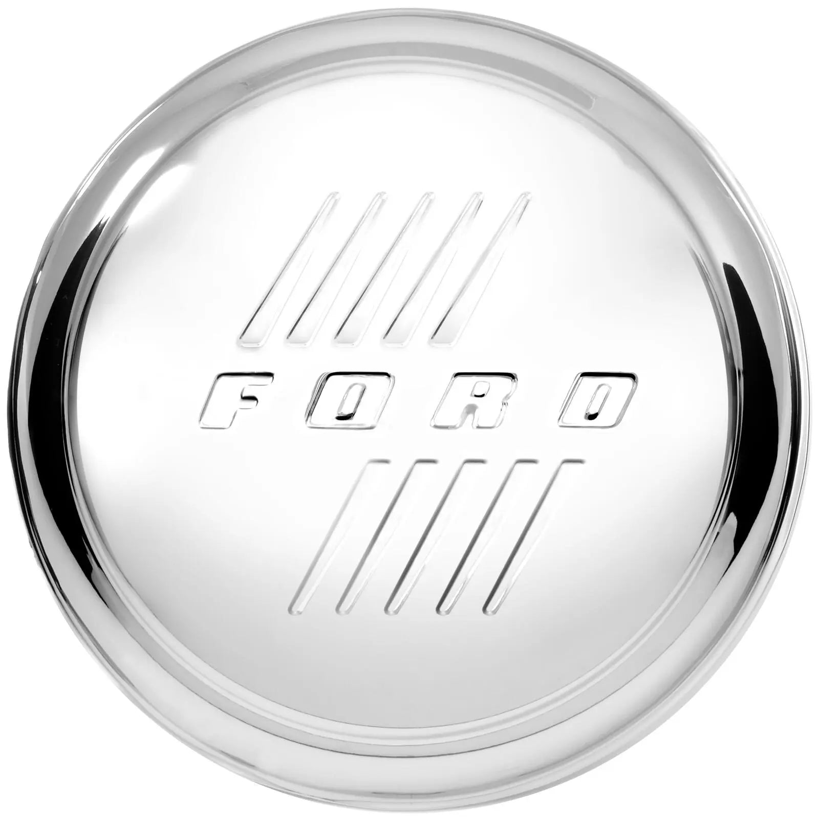 Official Ford licensed reproduction hub caps. Used on both cars and trucks, these hubcaps measure 8 1/8" on the inside diameter ring and will only fit wheels with knobs facing inward. Caps come in a show quality polished stainless steel.