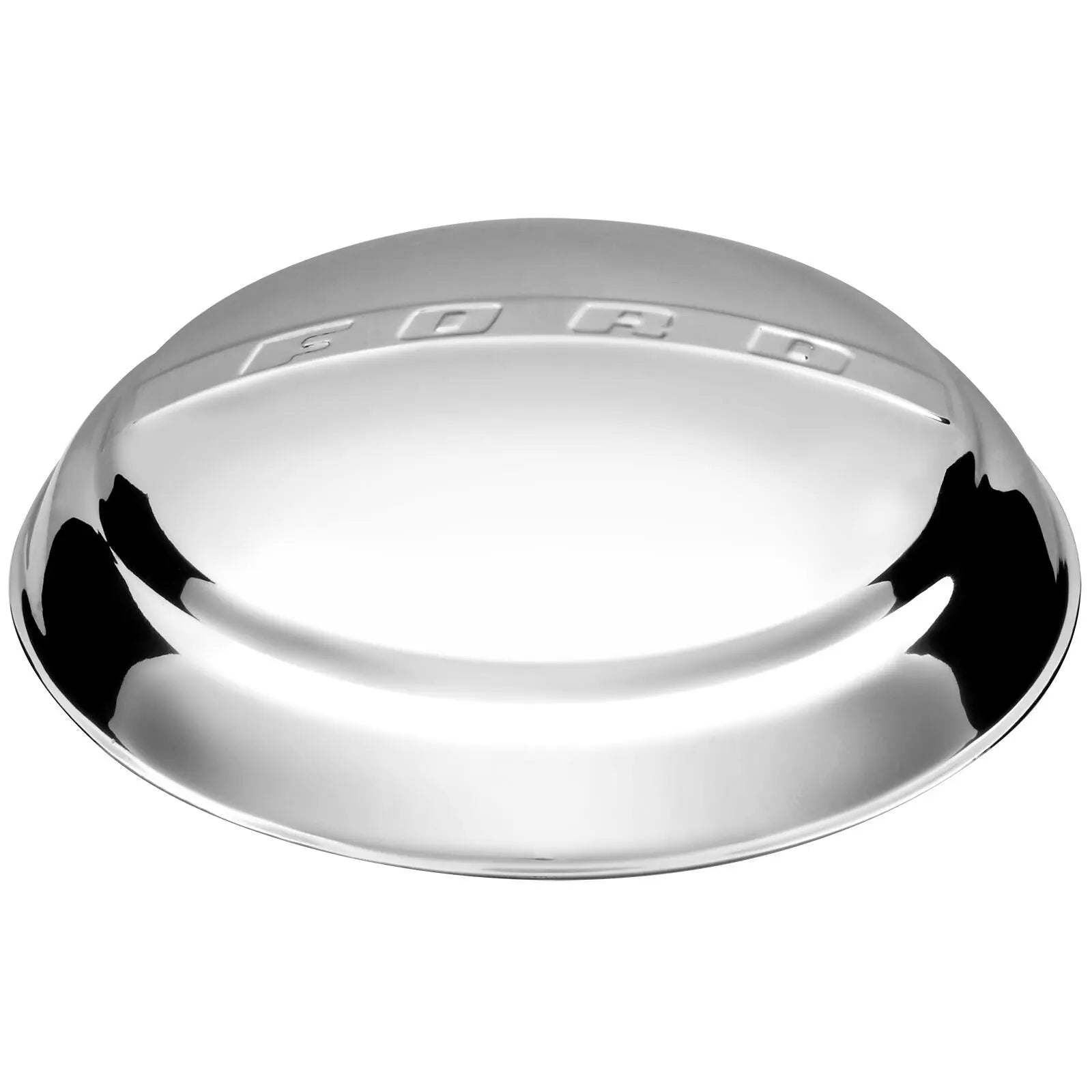 Official Ford licensed reproduction hub caps. Used on both cars and trucks, these hubcaps measure 8 1/8" on the inside diameter ring and will only fit wheels with knobs facing inward. Caps come in a show quality polished stainless steel.